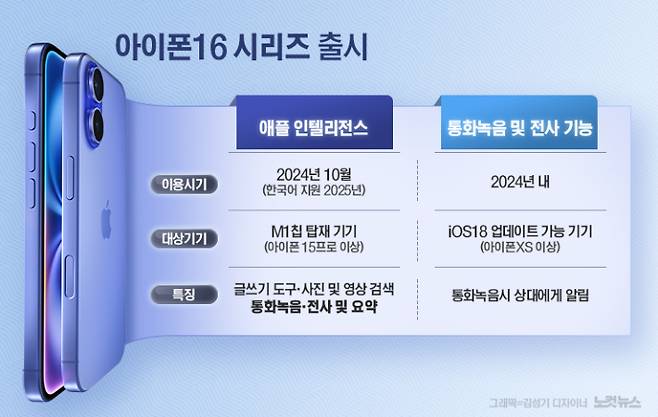 애플이 변했다. 아이폰16 시리즈 1차 출시국에 한국을 처음으로 포함하고 애플의 인공지능 시스템인 '애플 인텔리전스(Apple Intelligence)' 지원 언어에도 한국어 등 더 많은 나라의 언어를 더 빨리 포함하기로 했다. 아이폰 탄생 이후 17년 동안 금지됐던 통화 녹음 기능도 선보인다.