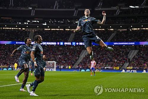 Leipzig's Benjamin Sesko, right, celebrates after scoring the opening goal during to the Champions League opening phase soccer match between Atletico Madrid and RB Leipzig at the Metropolitano stadium, in Madrid, Thursday, Sept. 19, 2024. (AP Photo/Manu Fernandez)