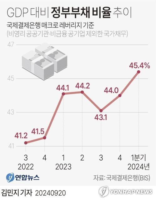 (서울=연합뉴스) 김민지 기자 = 20일 국제결제은행(BIS)에 따르면 우리나라 국내총생산(GDP) 대비 정부부채 비율은 올해 1분기 말 기준 45.4%로 집계돼 역대 최고 수준을 기록했다.