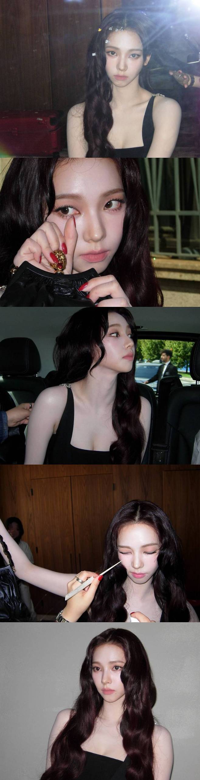 공개된 사진 속 카리나는 블랙 드레스를 입은 채 인형같은 비주얼을 뽐내고 있다. 헤어메이크업을 받는 중 찍은 사진부터 일정을 이동하며 찍은 사진까지 일상을 공유했다.