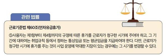 그렇다면 근로자가 연차를 사전에 신청하기만 하면 회사는 무조건 연차 사용을 인정해줘야 하는 것일까요? 꼭 그렇진 않습니다. 근로기준법 제60조 제5항에 보면 "근로자가 청구한 시기에 휴가를 주는 것이 사업운영에 막대한 지장이 있는 경우 그 시기를 변경할 수 있다"고 돼 있습니다.