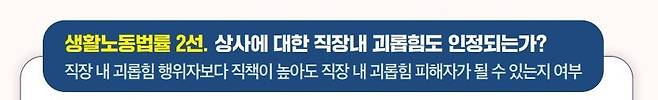 중노위 관계자는 "직장내 지위가 아닌 관계의 우위를 이용한 행위도 직장내 괴롭힘 행위가 될 수 있으므로 행위자가 관계상의 우위를 이용했는지 확인하는 것은 매우 중요하다"며 "관계의 우위는 연차, 근속년수, 직장내 영향력 등 사실상 우위를 점하고 있다고 판단되는 모든 내용이 포함될 수 있다"고 설명했습니다.