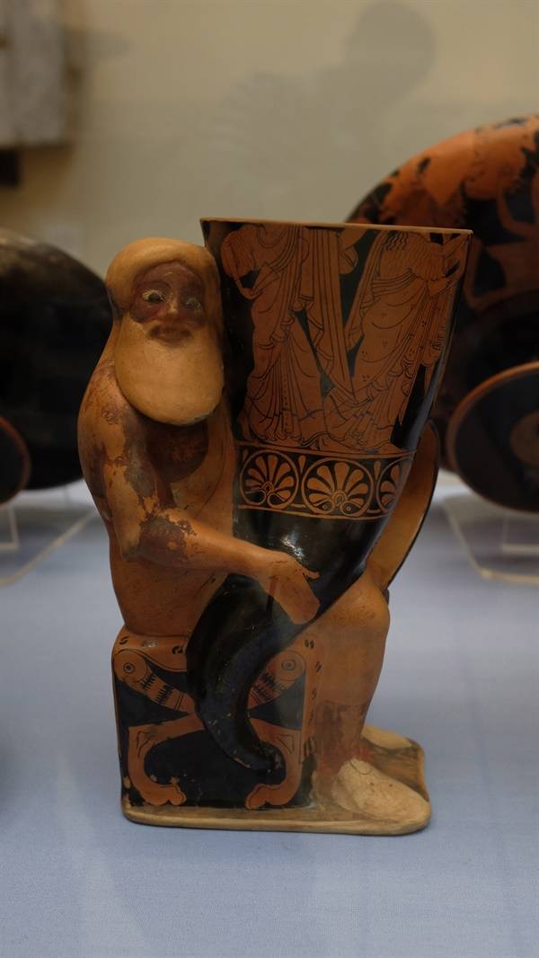 | ▲ 디오니시스가 세 명의 신들이 새겨진 술잔을 들고 있다 |