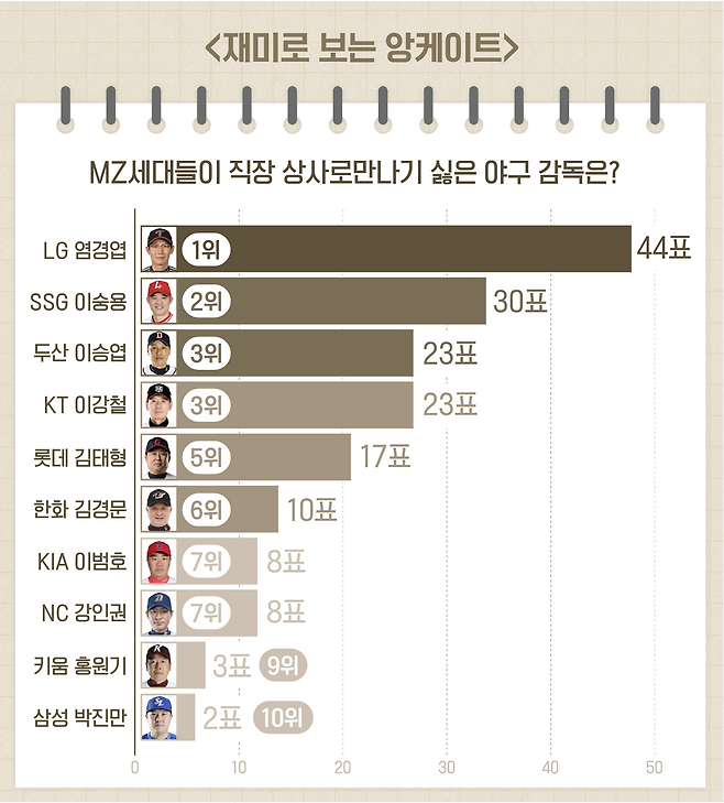 올 시즌 야구를 처음 직관한 2030 관중들을 포함해 야구팬 150명을 대상으로 한 설문의 주제는 'MZ 세대들이 직장 상사로 만나기 싫은 야구 감독'이었다.