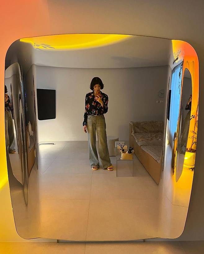 사진 속 김새롬은 아파트 거실에서 거울을 바라보며 셀카를 찍고 있는 모습. 최근 김새롬이 구입했다고 알린 럭셔리한 디자인의 거울이 시선을 사로잡는다.