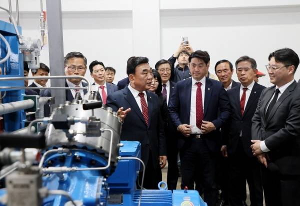 | ▲ 2023년 4월 7일 오후 3시 울산 남구 상개동 상개화물자동차휴게소에서 열린 ‘울산상개 에스케이(SK)수소충전소 준공식’에서 김두겸울산시장이 충전소 시설을 점검하고 있다. |