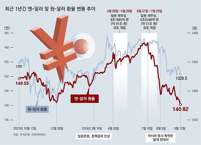 이후 일본 정부가 대규모 외환시장 개입을 단행하고 미국 중앙은행 연방준비제도(Fed·연준)의 금리 인하 가능성이 제기되면서 엔화 가치는 8월 들어 140엔대에 안착했다. 이달 16일에는 139엔대까지 떨어져 2023년 7월 이후 가장 낮은 수준을 기록했다(엔 강세). 엔화는 7월 이후 채 두 달도 안 돼 약 13% 떨어졌다.