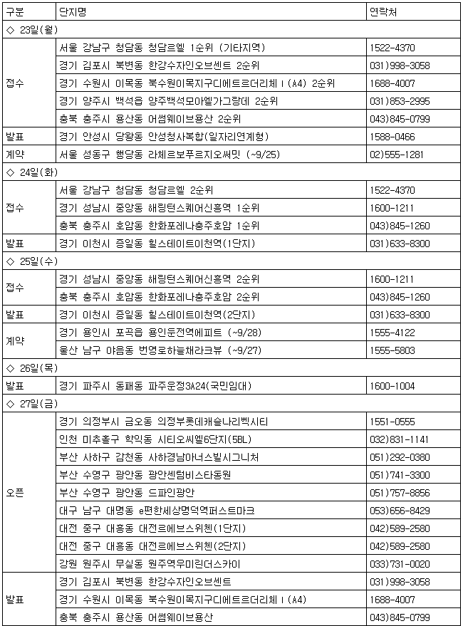 (서울=연합뉴스) 권혜진 기자 = 추석 연휴가 끝난 내주 전국에서는 2개 단지, 총 2천819가구(일반분양 1천492가구)가 분양한다.