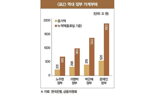 가계부채도 역대 정권을 거치며 지속적으로 증가했다. 노무현 정부에선 김대중 정부 때보다 201조 원 늘어나 665조 원이 됐고, 이명박 정부 964조 원(298조 원 증가), 박근혜 정부 1343조 원(379조 원 증가), 문재인 정부 1863조 원(520조 원 증가) 등 꾸준한 증가세를 보였다. <표2 참고> 이 역시 문재인 정부에서 가장 큰 폭으로 늘었다.