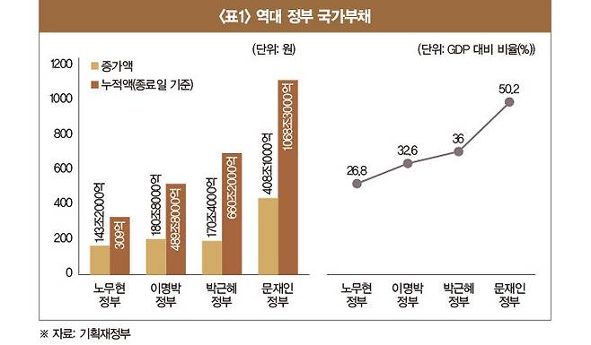 실제 국가부채는 최근 20여 년 동안 꾸준히 늘어난 가운데 문재인 정부에서 가장 크게 늘었다. 노무현 정부에서 309조 원이던 국가부채는 이명박 정부 489조8000억 원, 박근혜 정부 660조2000억 원까지 증가했다가 문재인 정부 때 408조1000억 원 늘어 1000조 원을 돌파, 1068조3000억 원으로 늘었다(각 정부 종료일 기준). 같은 기준 GDP 대비 국가부채 비율도 노무현 정부 26.8%, 이명박 정부 32.6%, 박근혜 정부 36%로 늘다가 문재인 정부 때 50.2%로 치솟았다.<표1 참고>