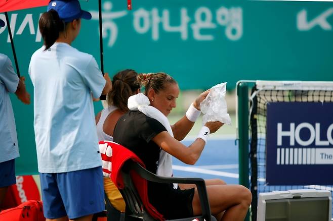 <사진> 35도를 넘나드는 폭염에 열기를 식히고 있는 하나은행 코리아오픈 출전 선수. 테니스코리아 제공