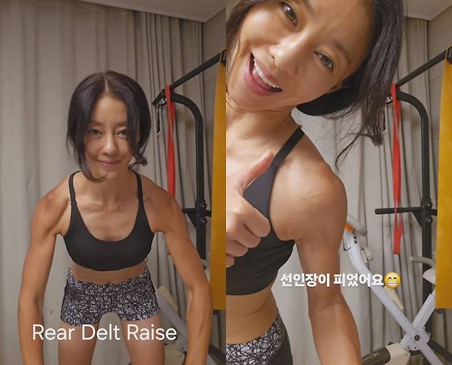 크롭탑을 입고 운동하는 모습을 보여준 이지현은 마른 몸에 넘치는 근육으로 눈길을 모았다.