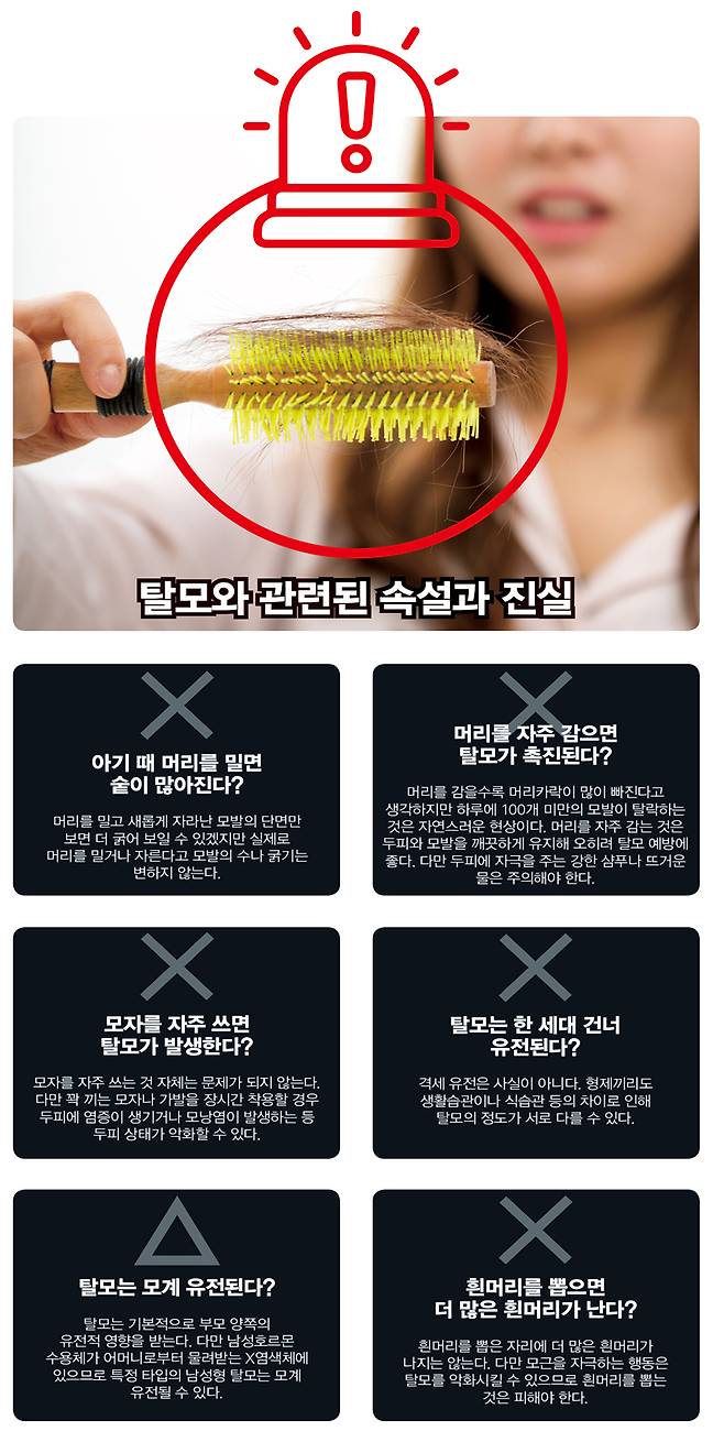 성장기가 점점 짧아져 머리카락이 가늘어지고 특정 부위의 모발이 빠지는 것이 탈모다. 빗질할 때나 머리 감을 때 머리카락이 가을 낙엽처럼 수북이 빠지면 심리적 고통이 크다. 혼자 고민한다고 탈모는 해결되지 않는다. 탈모 때문에 스트레스를 받아 탈모가 악화될 뿐이다. 의료인의 도움을 받는 편이 현명하다. 탈모를 피할 방법은 없지만 원인을 밝혀 약물·시술 등으로 진행을 늦출 수는 있다. 권오상 서울대병원 피부과 교수는 "탈모는 하나의 노화 현상이다. 노화를 멈출 수 없듯 탈모도 완벽히 치료하기 어렵다. 다만 일찍 관리하면 개선할 수 있다. 모발이 가늘어지고 많이 빠진다고 느끼면 병원의 도움을 받는 것이 좋다"고 강조했다.