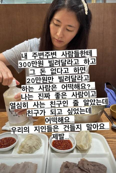 김미려는 22일 "내 주변주변 사람들한테 300만 원 빌려달라고 하고 그 돈 없다고 하면 20만 원만 빌려달라고 하는 사람은 어떡해요? 나는 진짜 좋은 사람이고 열심히 사는 친구인 줄 알았는데 친구가 되고 싶었는데 어떡해요"라며 자신의 고민을 토로했다.