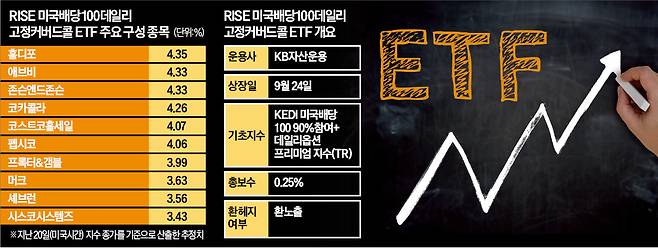 KB자산운용은 ‘RISE 미국배당100데일리고정커버드콜’ ETF를 24일 유가증권시장에 상장한다. 이 상품이 추종하는 지수는 국내 언론사 가운데 유일한 지수산출기관인 한국경제신문의 ‘KEDI 미국배당100 90%참여+데일리옵션 프리미엄지수(TR)’다. 한경의 지수 브랜드 ‘KEDI(Korea Economic Daily Index)’를 활용한 상품이 나오는 건 이번이 19번째다.