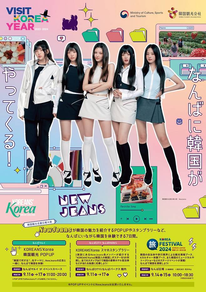 이 곳에는 인생네컷 포토부스, 관람객 메시지 참여 보드, 뉴진스 포토월 등이 마련돼 현지 MZ세대 등의 큰 호응을 얻었다. 입장을 위해서 일본 젊은이들이 길게 줄을 서기도 했다. 초대형 쇼핑몰인 난바파크스와 오사카에서 가장 큰 쇼핑몰인 난바시티 곳곳에서도 뉴진스가 출연한 한국관광 해외광고가 송출됐다.
