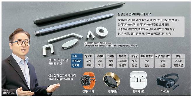 삼성전기는 적층세라믹콘덴서(MLCC) 사업에서 확보한 적층, 소성(열처리), 세라믹 재료 기술 등을 활용해 소형 전고체 배터리 개발에 성공했다. MLCC는 반도체와 함께 정보기술(IT)·자동차 산업의 '쌀'로 불리는데, 삼성전기는 일본의 무라타와 함께 MLCC 분야에서 세계 최고 수준의 기술력을 보유하고 있다.