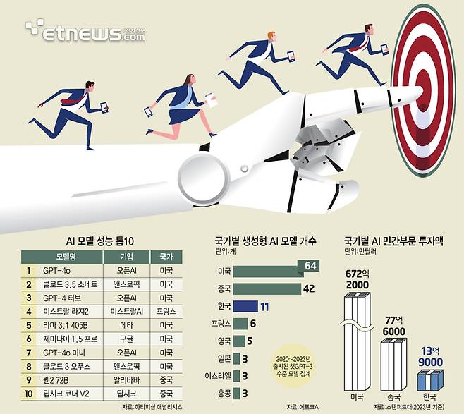 스탠퍼드대가 발표한 '인공지능 지수(AI INDEX) 2024' 보고서에 의하면, 2023년 AI 민간부문 투자액 순위는 미국이 672억2000만달러(약 89조3000억원)로 압도적 1위, 중국이 77억6000만달러(약 10조3000억원)로 2위를 차지했다.