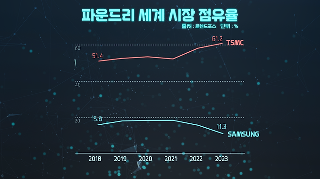 TSMC와 삼성전자의 시장점유율 격차는 50%포인트로, 5년 전보다 더 벌어졌습니다.