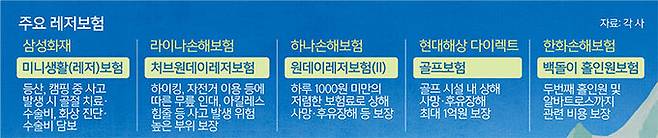 먼저 삼성화재의 ‘미니생활(레저)보험’은 야외활동에서 발생하는 사고에 대비해 필요한 보장항목을 선택할 수 있는 맞춤형 상품이다. 가벼운 등산이나 캠핑 중 사고엔 골절 치료·수술비, 화상 진단·수술비 등을 보장한다. 더불어 운전 중 사고로 발생하는 손해도 보장한다. 형사적 책임에 따른 벌금, 변호사 선임비, 교통사고처리지원금 등이 대상이다. 단 음주·무면허, 약물을 먹고 운전하는 등 형사처벌 대상 사고 발생은 보장하지 않는다. 보험 기간은 1∼30일 중 원하는 대로 택할 수 있다.