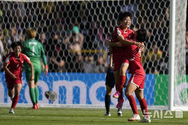 [보고타=AP/뉴시스] 북한의 최일선(가운데)이 22일(현지시각) 콜롬비아 보고타의 엘 캄핀 스타디움에서 열린 2024 국제축구연맹(FIFA) 20세 이하(U20) 여자 월드컵 결승전 일본과 경기 전반 15분 선제골을 넣고 동료들과 환호하고 있다. 북한이 일본을 1-0으로 꺾고 이 대회 3번째 우승컵을 들어 올렸고 최일선은 최다 득점(6골)을 기록했다. 2024.09.23.