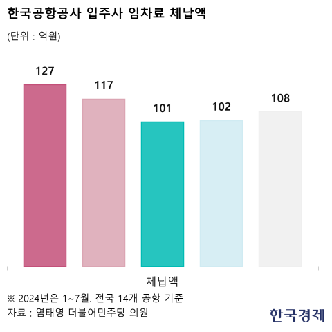 23일 국회 국토교통위원회 소속 염태영 더불어민주당 의원이 한국공항공사(KAC)에서 받은 자료에 따르면 전국 14개 공항 입주 기업들이 1~7월 체납한 임차료가 108억원으로 집계됐다. 이는 지난 2022년(101억원)과 2023년(102억원) 연간 체납액을 이미 넘어선 수준이다. 코로나19가 한창이던 2020년(127억원)과 2021년(117억원)에 육박하는 수준이다.
