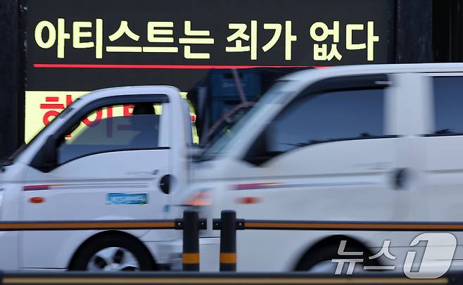 (서울=뉴스1) 이동해 기자 = 그룹 뉴진스 멤버들이 민희진 전 대표의 복귀를 오는 25일까지 요청한 가운데 23일 서울 용산구 하이브 사옥 앞에서 팬들이 사태 해결을 촉구하며 트럭 시위를 하고 있다.