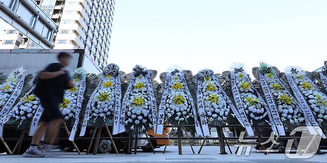 (서울=뉴스1) 이동해 기자 = 그룹 뉴진스 멤버들이 민희진 전 대표의 복귀를 오는 25일까지 요청한 가운데 23일 서울 용산구 하이브 사옥 앞에 팬들이 보낸 근조화환이 놓여 있다.