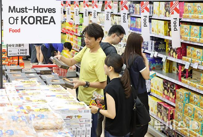 [서울=뉴시스] 황준선 기자 = 23일 서울 시내 한 대형마트 과자 매대에서 외국인 관광객들이 과자를 고르고 있다.