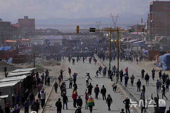 [엘알토=AP/뉴시스] 에보 모랄레스 전 볼리비아 대통령 지지자들(아래)이 22일(현지시각) 볼리비아 엘알토에서 수도 라파스로 행진하면서 루이스 아르세 현 정부 지지자들과 대치하고 있다. 모랄레스 지지자 수천 명이 라파스까지 행진하면서 현 정부 지지자들과 폭죽, 사제 폭발물, 돌 등을 서로에게 던지며 충돌했고 경찰은 최루탄을 발사했다. 볼리비아 보건부는 이 과정에서 최소 8명이 다쳤다고 밝혔다. 2024.09.23.