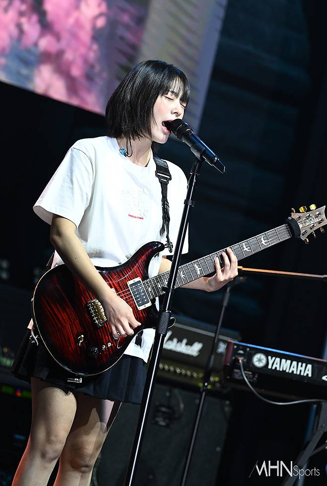 (MHN스포츠 이현지 기자) 걸밴드 '큐더블유이알'(QWER) 시연이 23일 오후 서울 서대문구 예스24 원더크로스홀에서 진행된 미니 2집 '알고리즘스 블러썸' 쇼케이스에서 신곡 무대를 선보이고 있다.