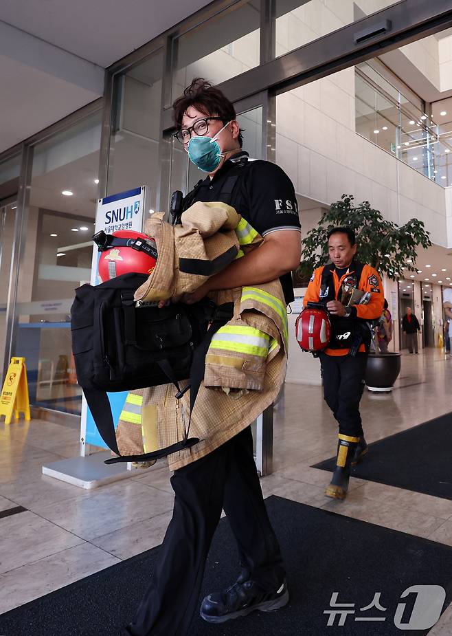 (서울=뉴스1) 구윤성 기자 = 23일 오후 3시 4분쯤 서울 종로구 연건동 서울대학교병원 암센터 2층에서 불이 나 640명이 대피한 가운데 화재 진압을 마친 소방대원이 현장에서 철수하고 있다. 소방 당국은 인원 89명과 차량 25대를 투입해 화재 발생 3분 만인 3시 7분에 불을 완전히 껐다. 2024.9.23/뉴스1