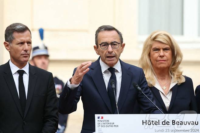 (파리 AFP=뉴스1) 김지완기자 = 프랑스 미셸 바르니에 총리 내각의 내무부 장관에 임명된 브루노 르타이오 신임 장관이 23일 파리 내무부 청사에서 진행된 내무장관 이취임식에서 취임 연설을 하고 있다. 르타이오 장관은 이민 강경파로 알려진 공화당 상원 원내대표 출신이다. 2023.09.23