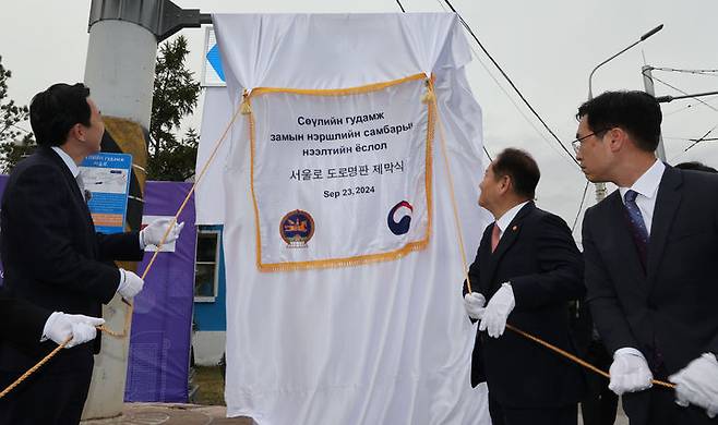 [서울=뉴시스] 고범준 기자 = 이상민(오른쪽 두번째) 행정안전부 장관과 냠오소르 오츠랄 몽골 내각관방부장관이 23일(현지시간) 몽골 울란바토르 시내 중심가에 위치한 서울의 거리 도로명판 제막식에서 양국 참석자들과 도로명판 제막하고 있다. (사진=행정안전부 제공) 2024.09.23. photo@newsis.com *재판매 및 DB 금지