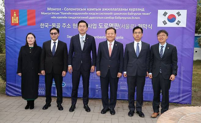 [서울=뉴시스] 고범준 기자 = 이상민(오른쪽 세번쩨) 행정안전부 장관과 냠오소르 오츠랄 몽골 내각관방부장관 등이 23일(현지시간) 몽골 울란바토르 시내 중심가에 위치한 서울의 거리 도로명판 제막식에 참석해 기념 촬영을 하고 있다. (사진=행정안전부 제공) 2024.09.23. photo@newsis.com *재판매 및 DB 금지