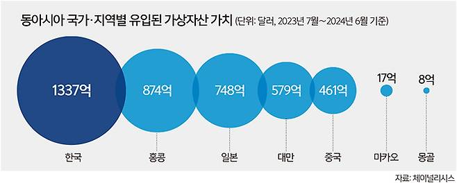 한국으로 유입된 가상자산의 규모가 동아시아 국가·지역 중 가장 큰 것으로 나타났다.