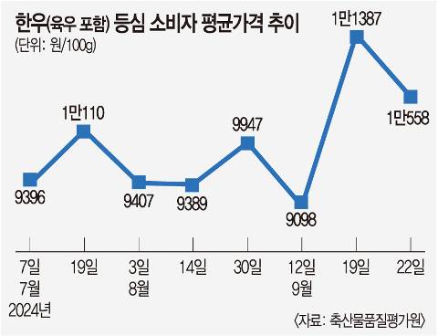 반면 소비자들이 많이 찾는 대형마트에서 판매되는 한우 가격은 이보다 높다. 이마트에서 판매하는 한우 가격은 이날 기준 한우 등심(구이용, 냉장) 1등급이 100g당 1만880원(정상가 기준), 홈플러스는 9170원에 판매됐다. 한우 판매 식당의 경우 대형마트에 비해 가격 탄력성이 떨어져 가격 하락을 체감하기 더 어렵다. 강성진 고려대 경제학과 교수는 “아무래도 전반적인 장바구니 물가가 높은 것이 영향을 미친 것으로 보인다”며 “등심 등 인기 부위는 체감할 만큼 가격 하락이 어려운 것도 있다”고 말했다.