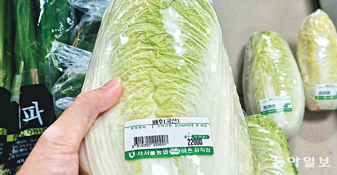 | 배추 1포기 2만2000원, 폭염-호우에 ‘김치 대란’ 23일 오후 서울 종로구 서서울농협하나로마트 사직지점에서 배추 1포기가 2만2000원에 팔리고 있다. 가을 폭염에 이어 호우 피해까지 겹치면서 최근 도매가가 평년의 두 배로 치솟은 데 따른 현상이다. 산지 물량을 확보해 1만 원 이하에 팔던 다른 대형마트에서도 가격이 오를 가능성이 크다. 이한결 기자 always@donga.com |