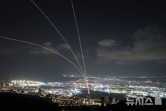 [하이파=AP/뉴시스] 23일(현지시각) 이스라엘 북부 하이파에서 바라본 이스라엘 아이언돔 방공 시스템이 레바논에서 발사된 로켓을 요격하기 위해 발사되고 있다. 이스라엘군이 이슬람 무장 정파 헤즈볼라를 겨냥해 레바논을 대대적으로 폭격해 2006년 이후 지상전 가능성이 최고조에 달하고 있다. 2024.09.24.