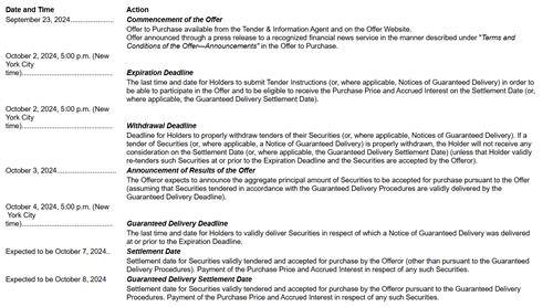 This is an indicative timetable showing one possible outcome for the timing of the Offer based on the dates in the Offer to Purchase. This timetable is subject to change and dates and times may be extended, re-opened or amended by the Offeror in accordance with the terms of the Offer as described in the Offer to Purchase. Accordingly, the actual timetable may differ from the timetable below.