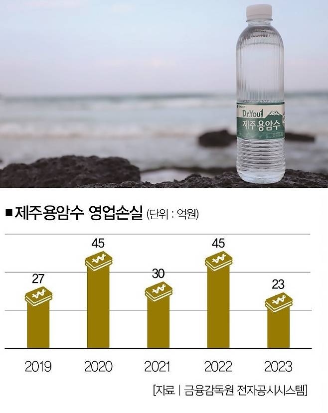 적자 규모도 상당하다. 오리온그룹 자회사이자 제주용암수의 생산업체 '오리온제주용암수'는 2019년(27억원)부터 2023년(23억원)까지 5년 연속 영업손실을 기록했다. 생수시장이 해마다 성장세를 거듭하고 있다는 점을 감안하면, 제주용암수의 부진은 더 도드라진다. 시장조사업체 닐슨코리아에 따르면 국내 생수 시장 규모는 2020년 1조2000억원에서 2조3000억원으로 3년 새 1.9배가 됐다.