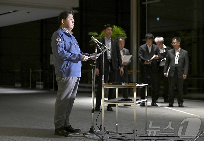 (도쿄 로이터=뉴스1) 우동명 기자 = 하야시 요시마사 일본 관방장관이 23일(현지시간) 도쿄에서 취재진을 만나 “러시아 군 초계기의 일본 영공 침범을 매우 엄중하게 항의했다”고 밝히고 있다. 2024.09.24