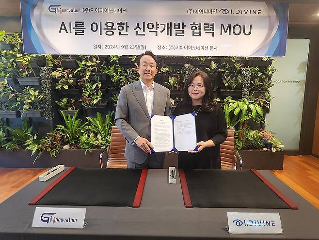 (서울=연합뉴스) 지난 23일 서울 송파구 지아이이노베이션 본사에서 열린 AI 활용 신약 개발을 위한 양해각서(MOU) 체결식에서 이병건 지아이이노베이션 회장(왼쪽)과 김송미 아이디바인 대표가 기념 촬영을 하고 있다. 2024.9.24 [지아이이노베이션 제공. 재판매 및 DB 금지]