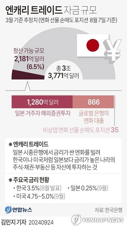 (서울=연합뉴스) 김민지 기자 = 한국은행은 24일 발표한 보고서를 통해 미국 정책금리 인하 등으로 엔 캐리 트레이드 유인이 축소될 경우 청산 가능성이 큰 자금의 규모를 32조7천억엔(2천억달러) 정도로 추산했다.