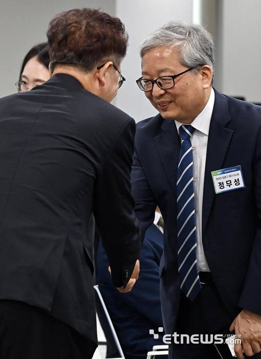 넷제로 챌린지 X 업무협약 및 발대식이 24일 서울 마포구 디캠프 프론트원에서 열렸다. 정무성 현대차 정몽구재단 이사장(오른쪽)과 강석훈 KDB산업은행 회장이 악수하고 있다.