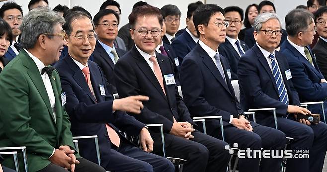 넷제로 챌린지 X 업무협약 및 발대식이 24일 서울 마포구 디캠프 프론트원에서 열렸다. 한덕수 국무총리가 김상협 2050탄소중립녹색성장위원회 민간공동위원장과 대화하고 있다. 왼쪽 세 번째부터 강석훈 KDB산업은행 회장, 박일평 LG사이언스파크 대표, 정무성 현대차 정몽구재단 이사장.