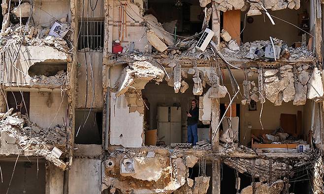 | 처참한 폭격 현장 23일(현지시간) 이스라엘군 공습으로 레바논 베이루트 남부의 한 아파트 벽면이 부서진 가운데 한 남성이 잔해를 살펴보고 있다. 베이루트=AP연합뉴스 |