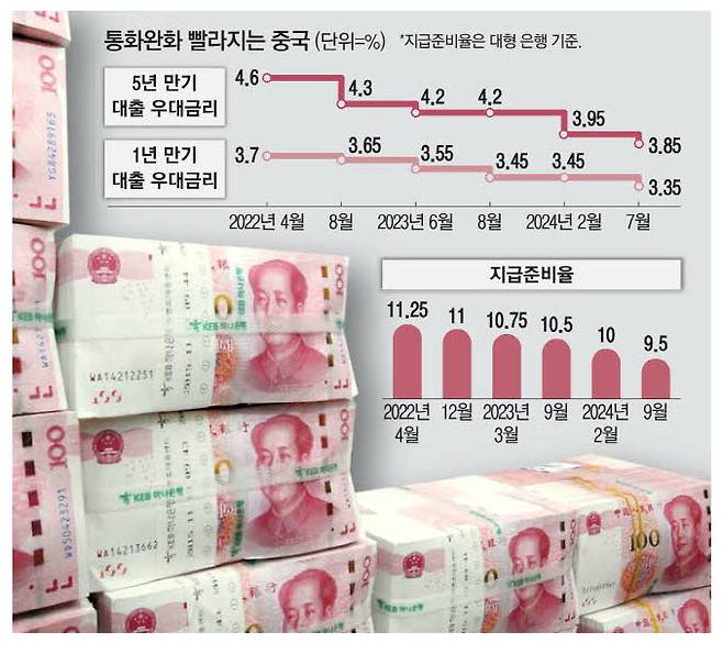 중국이 이례적으로 은행 지급준비율(지준율)과 정책 금리를 동시에 인하하기로 했다. 내수와 소비 둔화 등에 따른 경기 침체가 이어지면서 올해 목표로 내건 '5% 성장률' 달성이 어려워지자, 대규모 유동성 공급책을 꺼내든 것이다. 판궁성 중국 인민은행장은 24일 금융당국 합동 기자회견에서 "지준율을 조만간 0.50%포인트 낮춰 시장에 장기 유동성 1조위안(약 190조원)을 공급할 것"이라고 밝혔다. 다만 구체적인 인하 시점에 대해서는 언급하지 않았다. 이번 결정에 따라 대형은행의 지준율은 10.00%에서 9.50%로 낮아지게 된다. 현재 중국 금융권의 가중 평균 지준율은 약 6.9%다.