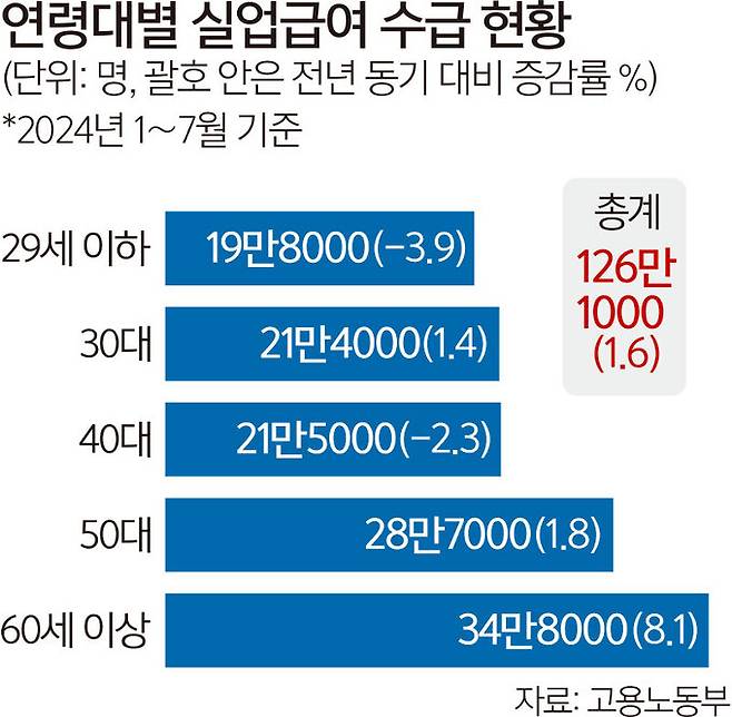 지난해 전체 실업급여 수급자 중 60세 이상 비율은 25.4%였는데 올해 1∼7월로 보면 27.7%를 기록해 소폭 증가했다.