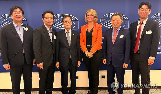(서울=연합뉴스) 윤진식 한국무역협회 회장이 24일(현지시간) 벨기에 브뤼셀에서 EU 의회 국제통상위원회 소속 마리-피에르 베드 렌느 의원과 면담 후 기념촬영을 하고 있다.